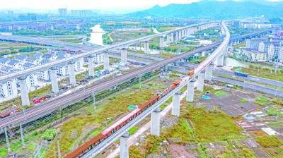 11月5日,在浙江省台州市,杭台高铁温岭至玉环段开始铺轨作业,标志着该工程从土建施工阶段全面转入轨道工程建设阶段。作为2022年1月开通运营的杭台高铁的延伸工程,温岭至玉环段新建正线约37公里,设温岭、温岭西、玉环3个车站,设计时速350公里。中铁十四局承担该工程玉环段线下工程建设及全线铺轨工程任务。图为建设者正在铺轨作业。袁瑞宇 摄