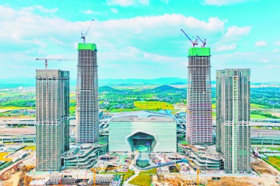 近日,由中铁建设承建的杭州西站枢纽南区站城综合体项目B塔楼冲破300米高度,主体结构顺利封顶。杭州西站枢纽南区站城综合体项目位于杭州云城核心区,总建筑面积约99.5万平方米,包含“云门”及四栋213至320米高的塔楼,项目建成后将成为杭州又一崭新地标。图为站城综合体。李静祎 摄