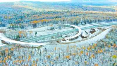 在吉林长白山,松长高速公路项目建设者在零下30摄氏度中克服严寒挑战,他们在预制梁生产区域安装蒸汽锅炉,预制台座预埋蒸养管道,搭设移动保温棚,构建全方位温控体系推进项目建设。截至12月18日,项目2811片预制梁架设已率先完成,建设进入最后冲刺阶段。图为松长高速公路池西互通施工现场。